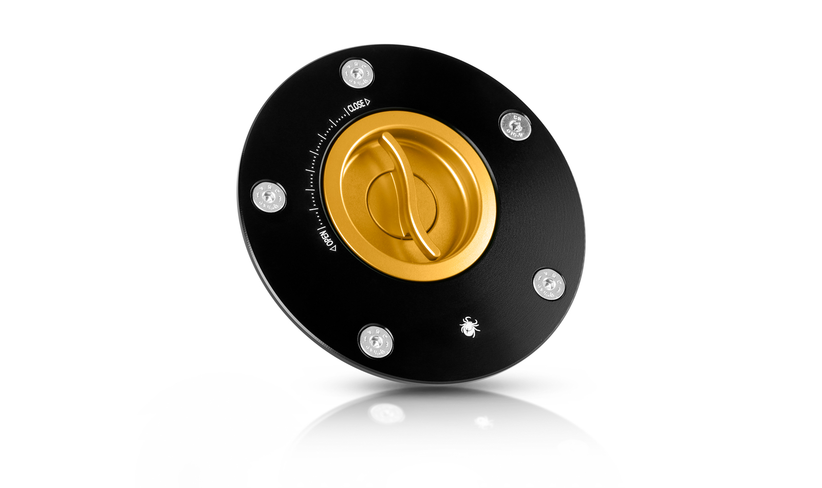 La chiusura a sgancio rapido (senza chiave) per il tappo del serbatoio carburante viene lavorata dal pieno tramite macchine a controllo numerico. Viene successivamente sottoposta al processo di anodizzazione dura superficiale. La chiusura per il tappo del serbatoio sostituisce senza bisogno di modifiche quella originale. Nota: prodotto compatibile con le flange serbatoio Paraxite.